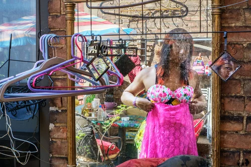 Koko is fitting the dress which she is trying to make for crossing dressing masseur job. Manhattan, New York. May 8, 2015.