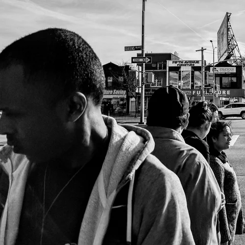 People are waiting for the traffic light to go in a different direction. Queens, New York. April 15, 2017.